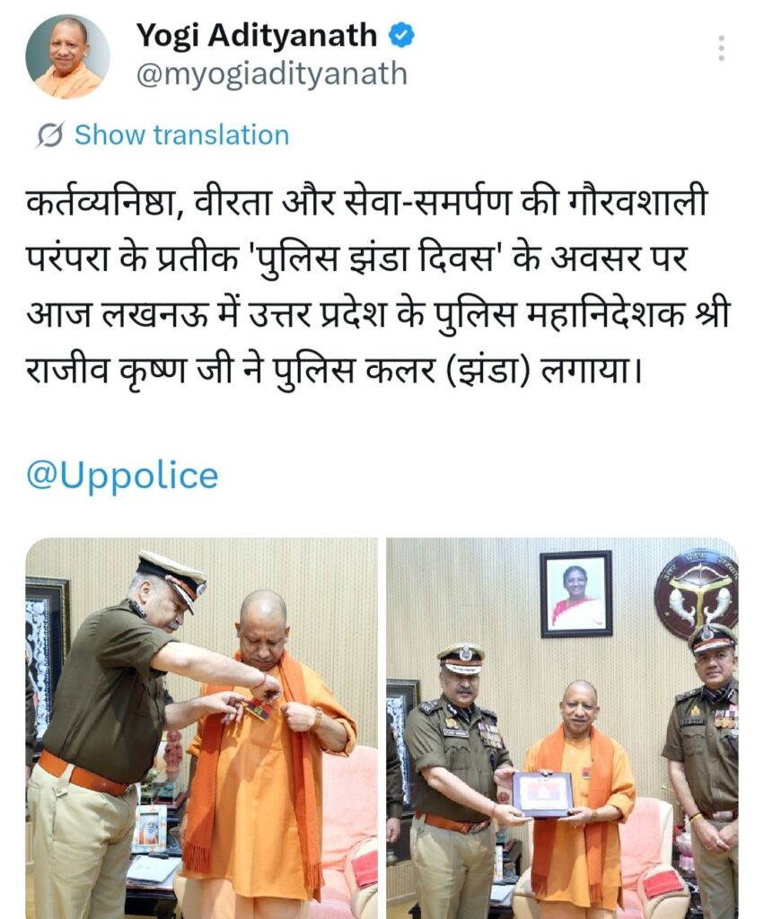 मुख्यमंत्री आवास पर हुए इस कार्यक्रम के सम्बंध में सीएम योगी ने X हैंडल पर पोस्ट करते हुए कहा कि कर्तव्यनिष्ठा, वीरता और सेवा-समर्पण की गौरवशाली परंपरा के प्रतीक ‘पुलिस झंडा दिवस’ के अवसर पर आज लखनऊ में उत्तर प्रदेश के पुलिस महानिदेशक श्री राजीव कृष्ण जी ने पुलिस कलर (झंडा) लगाया।