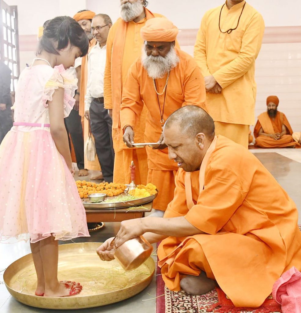 उसके बाद सीएम योगी ने कन्या पूजन का पारंपरिक अनुष्ठानकिया, जिसमें मुख्यमंत्री ने नौ कन्याओं और एक बटुक भैरव का पहले थाल में पांव पखारा और विधि-विधान से उनकी पूजा की। पूजा के क्रम में ही मुख्यमंत्री कन्याओं को अपने हाथों से भोजन भी कराया और भोजन कराने के बाद कन्याओं को दक्षिणा और उपहार भी दिया।