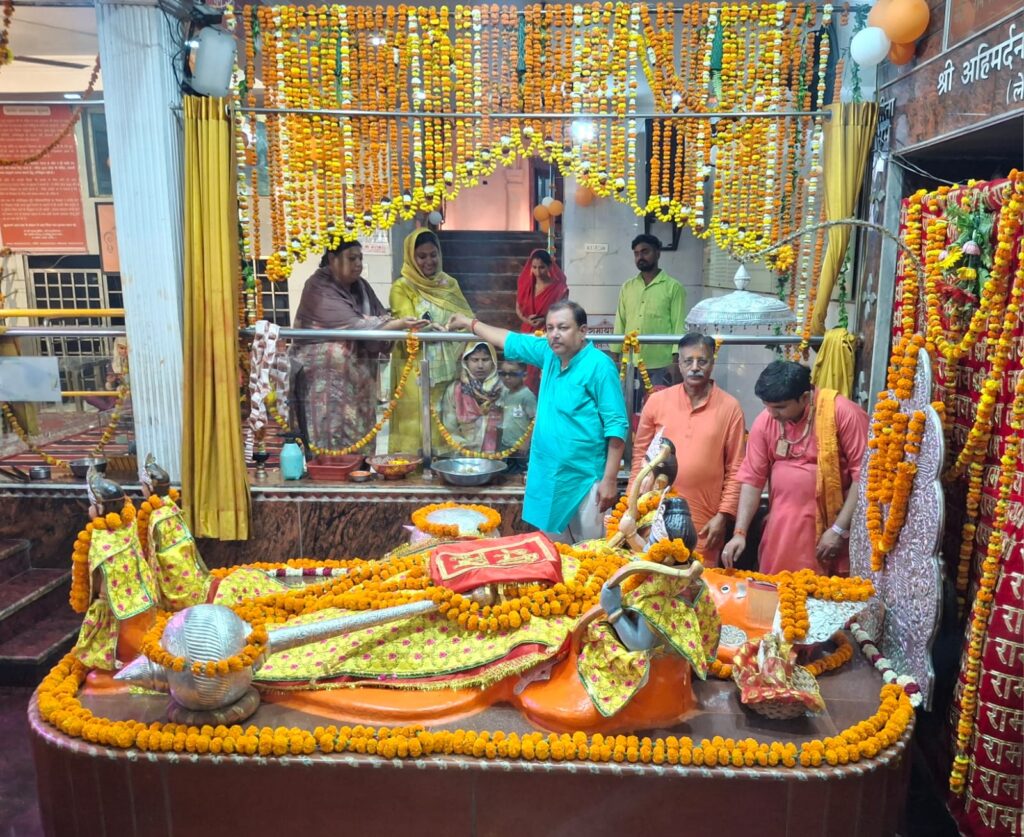 आज लेटे हुए हनुमान जी मंदिर में श्री हनुमान जन्मोत्सव धूमधाम से संपन्न हुआ| हनुमान जी का 51 किलो के लड्डू से भोग लगाया गया । पूरे मंदिर को केसरिया गुब्बारे से सजाया गया। हजारों भक्तों ने आज हनुमान जी का चोला और प्रसाद चढ़ाया । सुबह हनुमान जी को सिंदूर चढ़ाया गया और लंगोट वाला विशिष्ट श्रृंगार किया गया । इसके उपरांत ट्रस्ट के मुख्य सेवादार डॉ विवेक तांगड़ी (गुरु जी) द्वारा हनुमान जी की भव्य महाआरती उतारी गई । हनुमान जी की बाल रूप लेटी हुई अष्टधातु की मूर्ति को पंचामृत से सभी भक्तों द्वारा स्नान कराया गया । दोपहर में भजन गायक शशांक जी द्वारा सुंदरकांड का पाठ किया गया । मंदिर में आए हुए भक्तों ने भंडारे का आनंद उठाया । शाम को हनुमान जी का छप्पन भोग का प्रसाद चढ़ाया गया । इस अवसर पर ट्रस्ट के सेवादार डॉक्टर पंकज सिंह भदोरिया, रिद्धि किशोर गौड़ , आशीष अग्रवाल, अखिलेश कुमार, सुरेंद्र सूदन, अजय मेहरोत्रा, प्रहलाद अग्रवाल, लवलीन खोसला मुख्य रूप से उपस्थित थे ।
