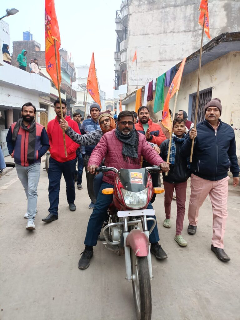 Jalaun news today । श्रीराम जन्मभूमि में निर्माणाधीन मंदिर में भगवान श्रीराम के विग्रह की प्राण प्रतिष्ठा को लेकर लगातार कार्यक्रम चल रहे हैं। मकर संक्राति के मौके पर नगर मोहल्लों में प्रभातफेरी निकाली गयी तथा विजय मंत्र का उच्चारण किया गया जिससे मोहल्लों में राम रस की धार बही।