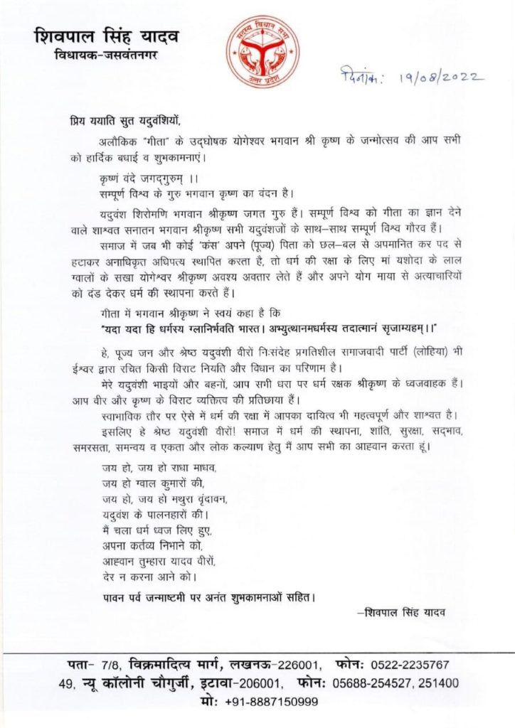 लखनऊ। प्रसपा अध्यक्ष शिवपाल सिंह यादव ने श्री कृष्ण जन्माष्टमी के अवसर पर सभी देश और प्रदेशवासियों को शुभकामनाएं दी। प्रसपा अध्यक्ष श्री यादव ने आज पत्र जारी कर लम्बा शुभकामना पत्र लिखा है इस पत्र में लिखा एक शब्द ने राजनीतिक गलियारों में चर्चा का विषय पैदा कर दिया है। दरअसल प्रसपा मुखिया ने पत्र में लिखा कि “समाज में जब भी कोई कंस अपने पूज्य पिता को छल-बल से अपमानित कर पद से हटाकर अनाधिकृत अधिपत्य स्थापित करता है, तो धर्म की रक्षा के लिए मां यशोदा के लाल ग्वालो के सखा योगेश्वर श्रीकृष्ण अवश्य अवतार लेते है और अपने योगमाया से अत्याचारियों को दंड देकर धर्म की स्थापना करते है”। कंस शब्द लिखना एक चर्चा का विषय बना हुआ है कि आखिर प्रसपा मुखिया ने इस शब्द का प्रयोग क्यों और किसके लिए किया ? उन्होंने अपने राजनैतिक दल प्रगतिशील समाजवादी पार्टी (लोहिया) को ईश्वर द्वारा रचित किसी विराट नियति और विधान का परिणाम बताया। आप भी पढ़िये प्रसपा मुखिया का शुभकामना सन्देश