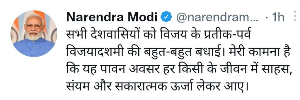 विजयदशमी के पर्व पर पीएम मोदी ने देशवासियों को शुभकामनाएं देते हुए कहा कि सभी देशवासियों को विजय के प्रतीक पर्व विजयदसमी की बहुत बहुत बधाई। उन्होंने कहा कि मेरी कामना है कि यह पावन अवसर हर किसी के जीवन मे साहस संयम और सकारात्मक ऊर्जा लेकर आये।