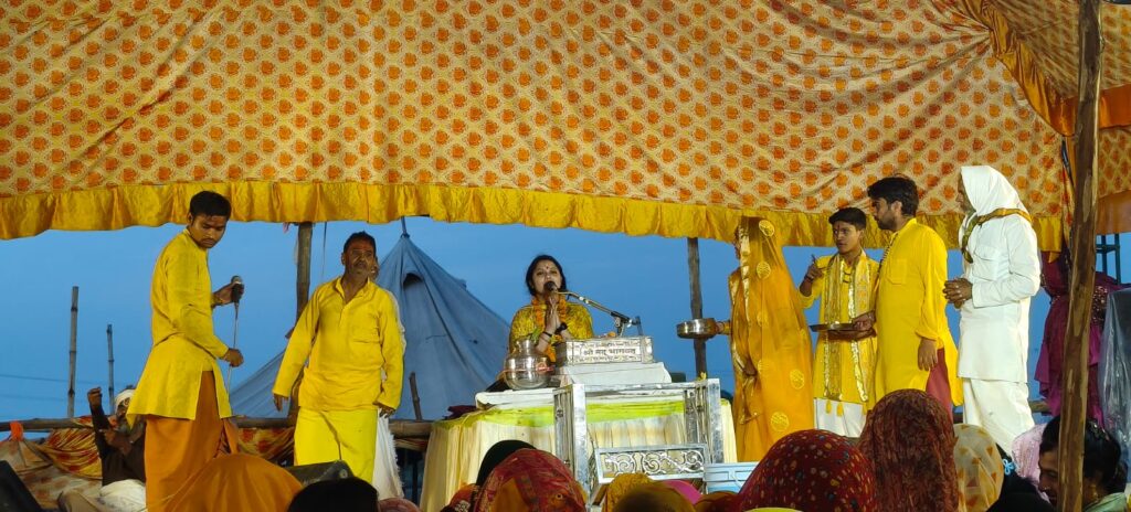 Jalaun news today । जालौन क्षेत्र के सिकरीराजा स्थित कुंवरजू बाबा महाराज मंदिर पर आयोजित भागवत कथा के पांचवें दिन बालि वामन प्रसंग एवं श्रीकृष्ण जन्म कथा सुनाई गई। भगवान श्रीकृष्ण के जन्म की कथा सुनकर भक्त भाव विभोर हुए।
