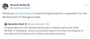 उल्लेखनीय है कि हाल ही में हुए पांच राज्यों के विधानसभा चुनाव तीन राज्यों में भाजपा ने प्रचंड जीत हासिल की तो वहीं तेलंगाना में कांग्रेस पार्टी की सरकार बनी है और वहां पर कांग्रेस के प्रदेश अध्यक्ष रेवंत रेड्डी को मुख्यमंत्री पद का चेहरा बनाया गया था जहां पर आज तेलंगाना के मुख्यमंत्री के रूप में रेवंथ रेड्डी ने शपथ ग्रहण कर ली है । तेलंगाना के मुख्यमंत्री के शपथ ग्रहण करने के बाद प्रधानमंत्री नरेंद्र मोदी ने उनको बधाई दी है । प्रधानमंत्री द्वारा दी गई बधाई का शुक्रिया अदा करते हुए तेलंगाना के मुख्यमंत्री रेवंथ रेड्डी ने पीएम मोदी का धन्यवाद अदा किया और उन्होंने भी सोशल मीडिया साइट एक पर लिखा कि तेलंगाना राज्य के विकास के लिए सहयोग की आपसे अपेक्षा है।