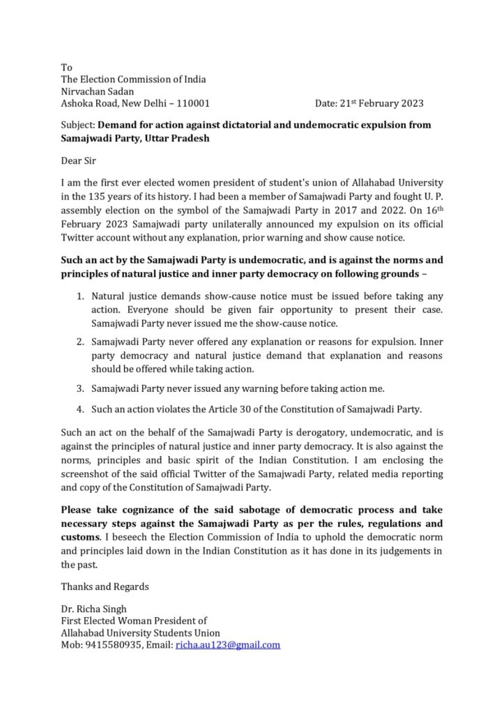 समाजवादी पार्टी से बीते दिनों निष्कासित की गईं इलाहाबाद केंद्रीय विश्वविद्यालय छात्र संघ की पूर्व अध्यक्ष व सपा नेत्री ऋचा सिंह ने पार्टी के खिलाफ कार्रवाई के लिए चुनाव आयोग से गुहार लगाई है। उन्होंने चुनाव आयोग को पत्र लिखकर कार्यवाही की मांग की है।आयोग को भेजे गए पत्र में उन्होंने कहा है कि उनका निष्कासन पार्टी संविधान के अनुरूप नहीं है। पार्टी के संविधान में निष्कासन जैसी अनुशासनात्मक कार्यवाही के लिए तीन सदस्य कमेटी बनाने की बात है जो उनके मामले में नहीं की गई है।