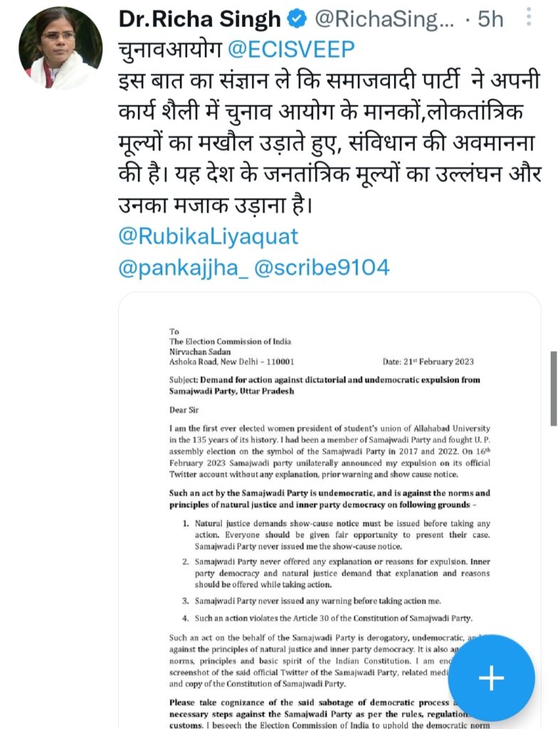 सपा से निष्कासित की गई ऋचा सिंह ने चुनाव आयोग को भेजे गए पत्र के सम्बंध में ट्वीट करते हुए जानकारी दी। उन्होंने कहा कि चुनाव आयोग इस बात का संज्ञान ले कि समाजवादी पार्टी ने अपनी कार्यशैली में चुनाव आयोग के मानकों लोकतांत्रिक मूल्यों का मखौल उड़ाते हुए संविधान की अवमानना की है । यह देश के जनतांत्रिक मूल्यों का उल्लंघन और उनका मजाक उड़ाना है।