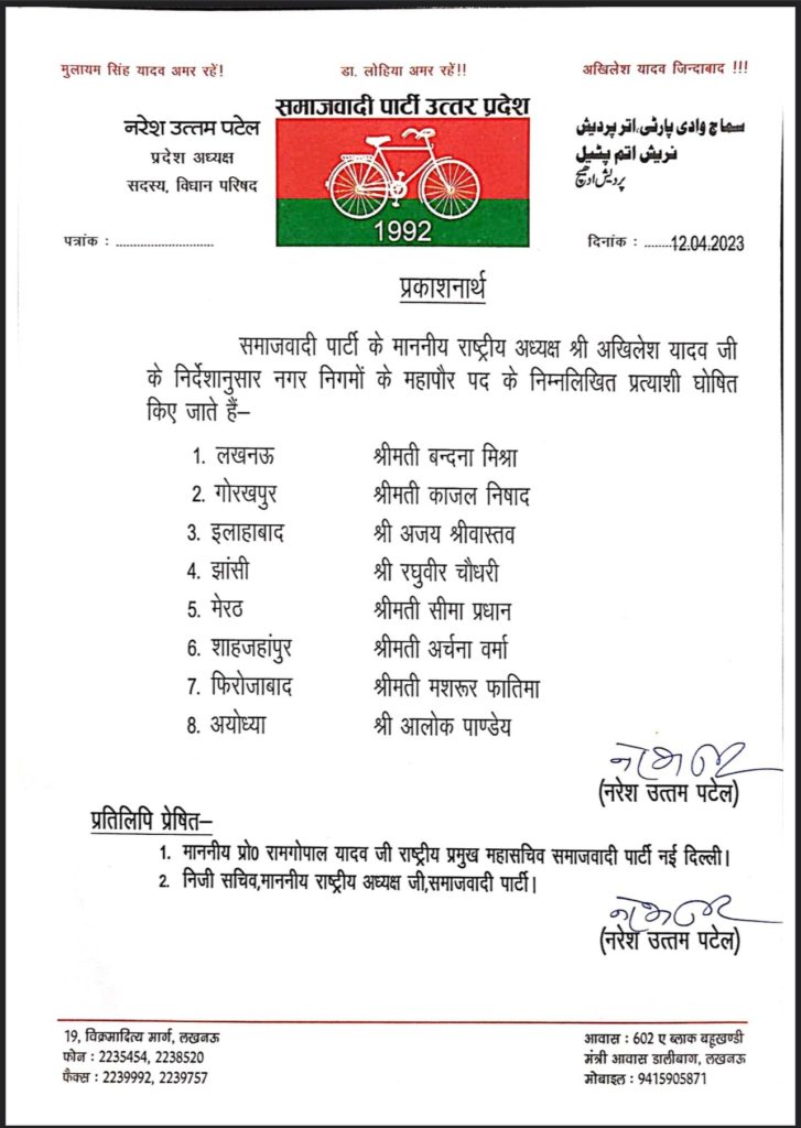 समाजवादी पार्टी ने लखनऊ समेत आठ जिलों के मेयर प्रत्याशियों के नामों का किया एलान,,देखिये पूरी लिस्ट