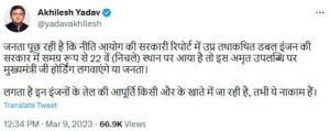 सपा मुखिया अखिलेश यादव ने गुरुवार को एक दूसरा ट्वीट करते हुए कहा कि जनता पूछ रही है कि नीति आयोग की सरकारी रिपोर्ट में उत्तर प्रदेश तथाकथित डबल इंजन की सरकार में समग्र रूप से 22 में निचले स्थान पर आया है तो इस अमृत उपलब्धि पर मुख्यमंत्री जी होर्डिंग लगवाएंगे या जनता लगता है इन इंजनों के तेल की आपूर्ति किसी और के खाते में जा रही है तभी यह नाकाम है।