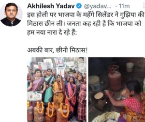 गुरुवार को समाजवादी पार्टी के राष्ट्रीय अध्यक्ष अखिलेश यादव ने पहले ट्वीट करते हुए कहा कि इस होली पर भाजपा के महंगे सिलेंडर ने गुजिया की मिठास छीन ली जनता कह रही है कि भाजपा को हम नया नारा दे रहे हैं अबकी बार छीनी मिठास