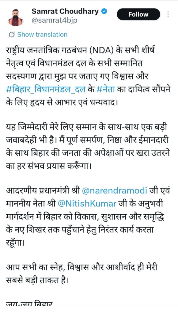 Bihar news today । एक बड़ी खबर बिहार की राजनीति से संबंधित मीडिया के प्रकाश में आई है। मीडिया रिपोर्ट के अनुसार बिहार में आज नए मुख्यमंत्री के नाम का ऐलान हो गया है वहां पर सम्राट चौधरी को नेता एनडीए बनाते हुए मुख्यमंत्री के नाम की मोहर भी लगा दी गई है।