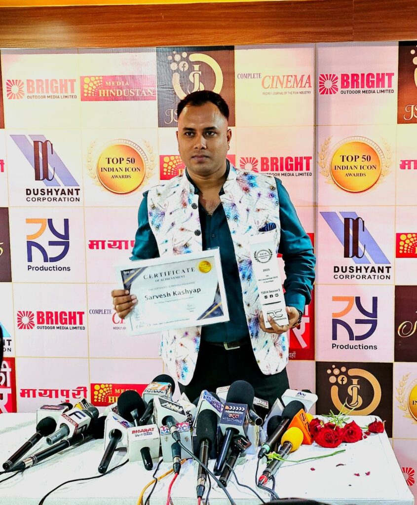 Sarvesh kashyap news /सर्वेश कश्यप को टॉप 50 इंडियन आइकॉन अवार्ड्स 2025 से सम्मानित किया गया । इस सम्मान के साथ सर्वेश कश्यप का नाम 2025 में देश के टॉप 50 आइकॉनिक पर्सनालिटी में शामिल हो चुका है। सर्वेश कश्यप के साथ इस सम्मान से मशहूर गायिका तृप्ति साक्या, देबोजित साहा, संगीतकार अंजन भट्टाचार्य, कॉमेडियन सुनील पाल,अभिनेता पंकज बेरी, रवि झांकल इत्यादि सहित देश के 49 अन्य नामचीन हस्तियों को भी नवाजा गया। बॉलीवुड गायिका जसपिंदर नरुल्ला व केंद्रीय मंत्री रामदास अठावले विशिष्ट अतिथि के रूप में मौजूद रहें। एक्टर मनीष पॉल, सुगंधा मिश्रा, प्रसिद्ध अभिनेता मुकेश खन्ना, गजेंद्र सिंह चौहान जैसे शख्सियत भी पा चुके हैं ये सम्मान।
