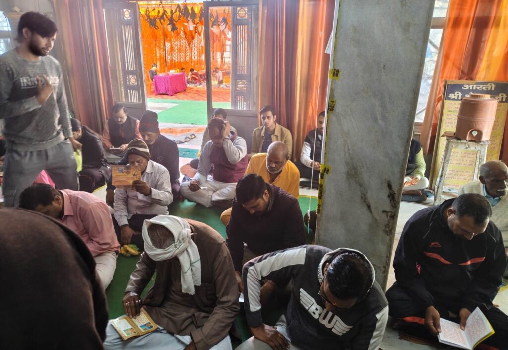 Jalaun news today । जालौन नगर के वीर बालाजी हनुमान मंदिर में सवा लाख अखंड श्री हनुमान चालीसा का पाठ चल रहा है। धार्मिक आयोजन के पांचवे दिन स्कूली बच्चों ने पहुंचकर हनुमान चालीसा का पाठ किया।