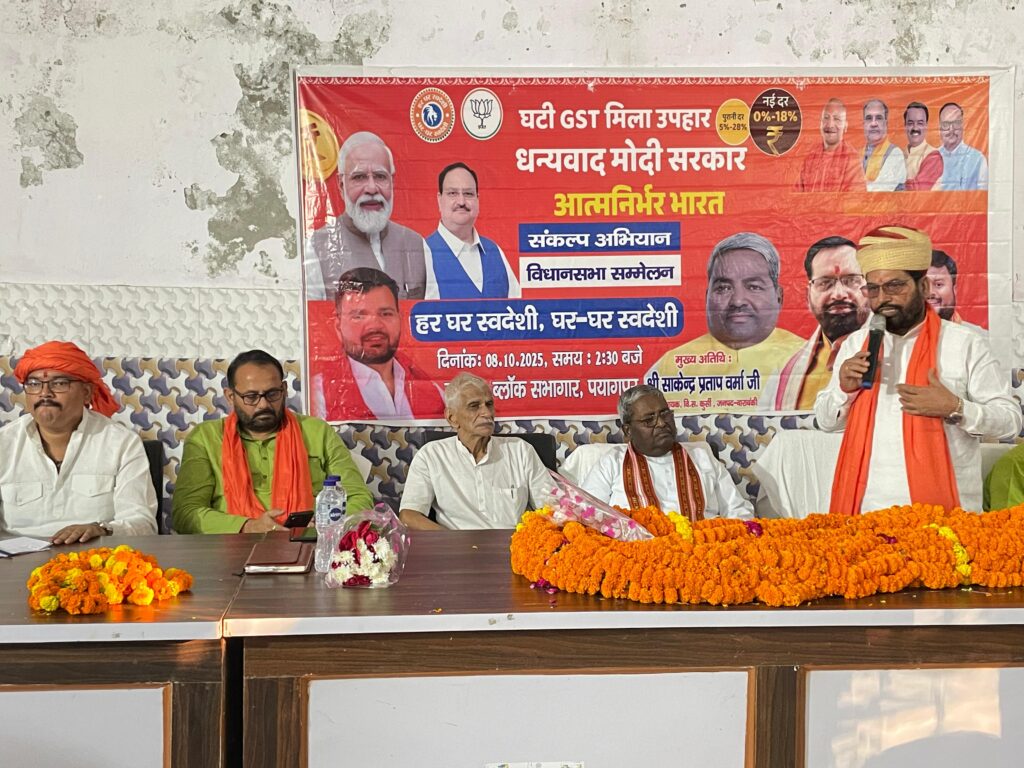 पयागपुर,बहराइच। आत्मनिर्भर भारत संकल्प अभियान के अंतर्गत आयोजित विधानसभा सम्मेलन में घटी जीएसटी, मिला उपहार धन्यवाद मोदी सरकार” का नारा जोश के साथ गूंजा। कार्यक्रम में पयागपुर क्षेत्र के प्रमुख व्यापारी, जनप्रतिनिधि और समाजसेवी बड़ी संख्या में उपस्थित रहे।