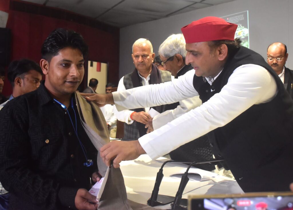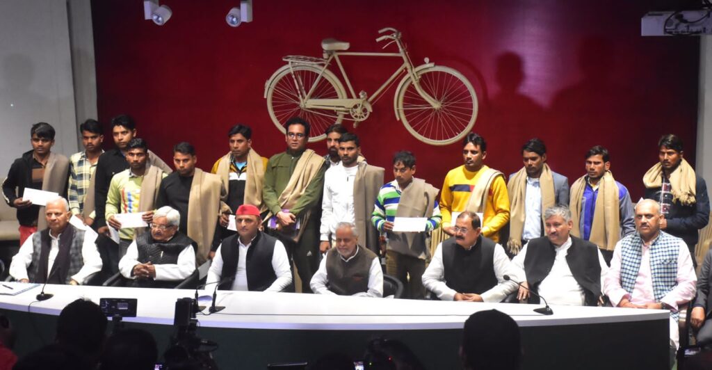 UP news today । समाजवादी पार्टी मुख्यालय, लखनऊ में शनिवार को उत्तराखण्ड की सुरंग में फंसे श्रमिकों को निकालने में जिन रैट होल माइनिंग टीम के सदस्यों ने अपनी हिम्मत और हौसले का प्रदर्शन किया था, उनका अभिनंदन किया गया।