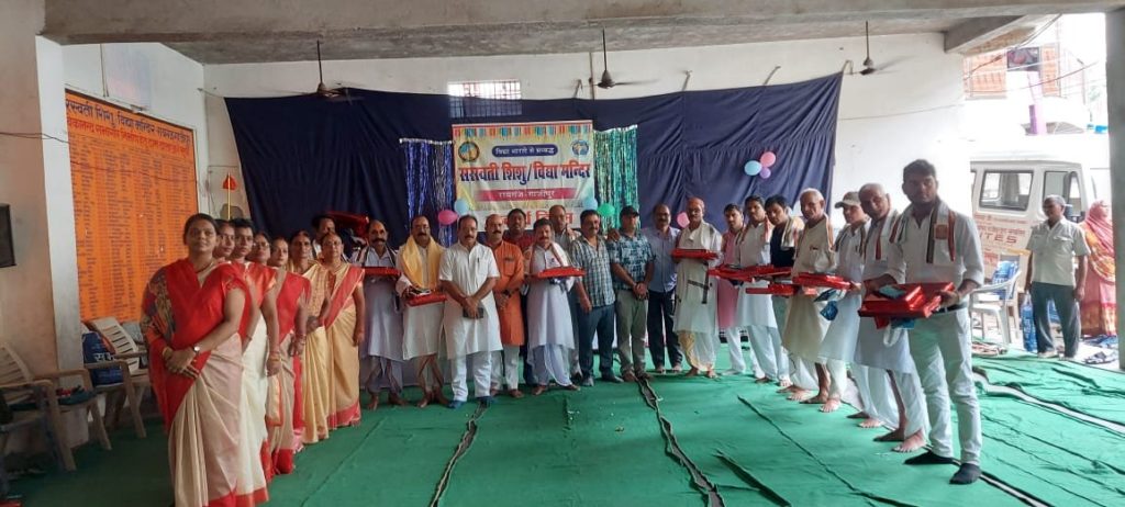 शिक्षाविद डॉ सर्वपल्ली राधाकृष्णन के जन्मदिवस पर मनाए जाने वाले शिक्षक दिवस के अवसर पर जनपद के रायगंज स्थित सरस्वती शिशु मंदिर के प्रांगण का पूरा वातावरण अद्भुत और भावविभोर हो गया। विद्यालय के लगभग 30साल पुराने छात्रों के समुह ने अपने गुरुजनों को सम्मानित कर उनका मान किया। मालूम हो कि 1990 के पास आउट छात्रों को शिक्षित करने वाले आचार्य नागेंद्र पांडेय अभी भी विद्यालय में अध्यापन कार्य में लगे हुए है, बाकी उस समय के शिक्षक क्रमशः सेवानिवृत्त हो चुके है।