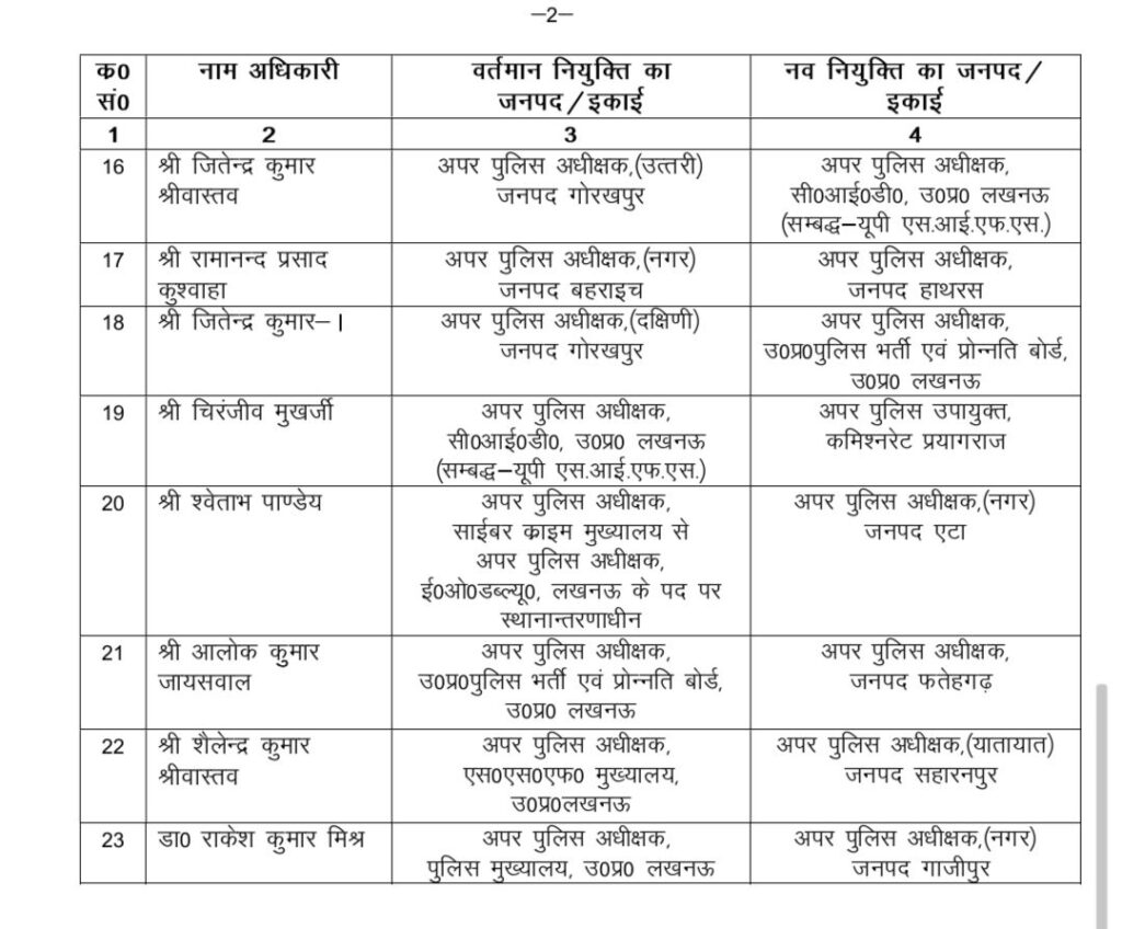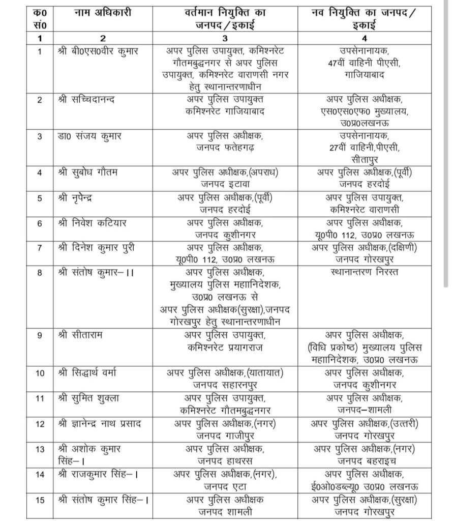 आज जिन अधिकारियों के तबादले हुए हैं उनमें गौतम बुद्ध नगर कमिश्नरेट में तैनात बी एस वीर कुमार को गाजियाबाद में 47वीं वाहिनी पीएससी में उपसेना नायक बनाया गया है तो वही सच्चिदानंद को अपर पुलिस अधीक्षक एसएसएफ लखनऊ बनाया गया है डॉ संजय कुमार को फतेहगढ़ से सीतापुर 27वीं वाहिनी पीएसी भेजा गया है सुबोध गौतम को इटावा से जनपद हरदोई अपर पुलिस अधीक्षक पूर्वी बनाया गया है निर्पेंद्र को हरदोई से वाराणसी पुलिस कमिश्नरेट में अपर पुलिस उपयुक्त बनाया गया है निवेश कटियार को कुशीनगर से अपर पुलिस अधीक्षक up 112 लखनऊ बनाया गया है दिनेश कुमार पूरी को अपर पुलिस अधीक्षक दक्षिणी गोरखपुर बनाया गया है । इसके अलावा जिनके तबादले हुए हैं देखिए पूरी लिस्ट