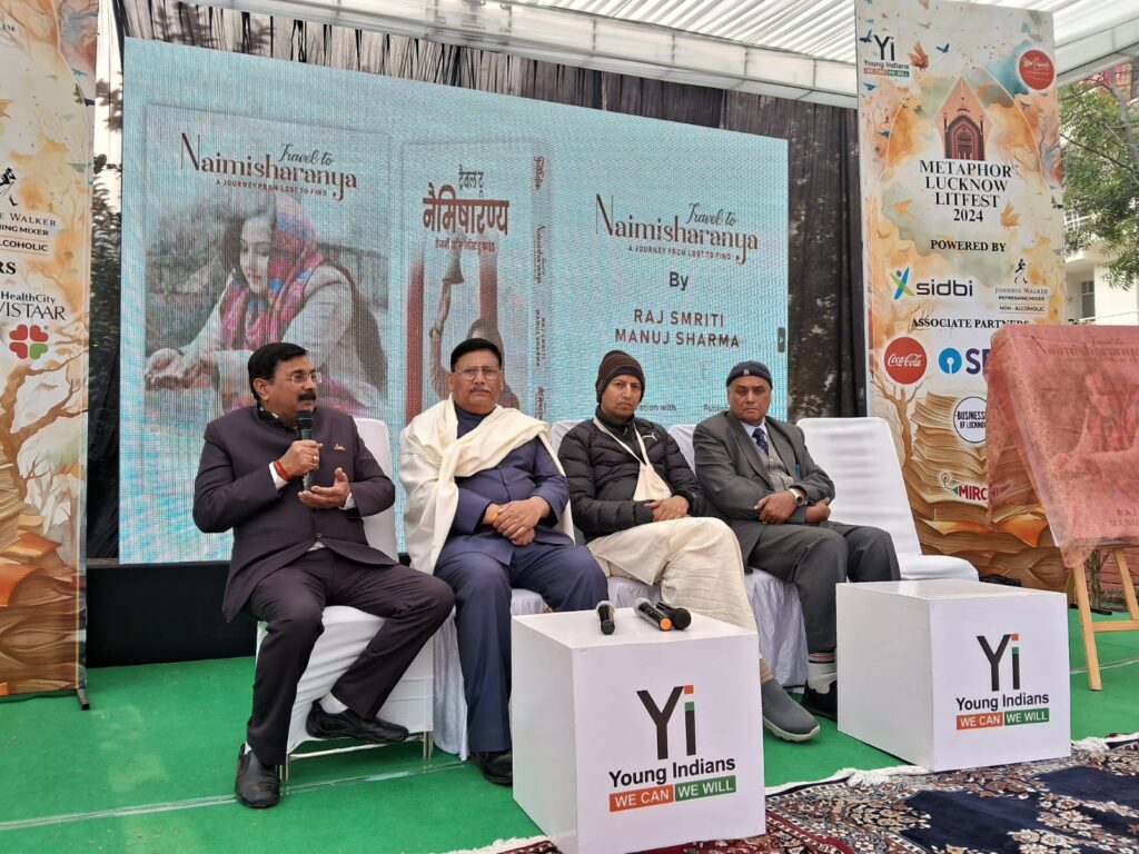 Lucknow news today ।लखनऊ में मकर संक्रांति के अवसर पर रविवार को मेटाफोर लिटरेचर फेस्टिवल 2024 ने “ट्रैवल टू नैमिषारण्य: ए जर्नी फ्रॉम लॉस्ट टू फाइंड” के पुस्तक के विमोचन कार्यक्रम का आयोजन किया गया। राज स्मृति और मनुज शर्मा के द्वारा लिखित इस साहित्यिक कृति ने दर्शकों के बीच काफी सराहना और प्रशंसा बटोरी। विभूतिखंड के सीआईआई परिसर में आयोजित इस कार्यक्रम में मुख्य अतिथि के रूप कवि वेदव्रत बाजपेई उपस्थित थे। उनके साथ सम्मानित अतिथि अपरिमय श्याम दास (अध्यक्ष- इस्कॉन, लखनऊ), चंद्रमणि सिंह (पूर्व सदस्य, लोक सेवा आयोग, यूपी) और डॉ. संजीव अवस्थी (संस्थापक- चेतना डेंटल सेंटर) भी मौजूद थे। दीप प्रज्ज्वलन के साथ प्रारंभ हुए कार्यक्रम में “ट्रैवल टू नैमिषारण्य: ए जर्नी फ्रॉम लॉस्ट टू फाइंड” का आधिकारिक विमोचन हुआ |