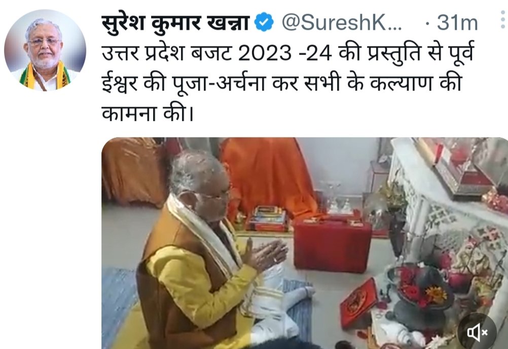 उल्लेखनीय है कि यूपी में आज 2023 – 24 का बजट पेश होगा। प्रदेश के वित्तमंत्री आज बजट पेश करेंगे। आज पेश होने वाले बजट के पहले वित्तमंत्री श्री खन्ना ने अपने आवास पर पूजा पाठ की इसके बाद वह बजट पेश करने के लिए निकले। उन्होंने कहा कि उत्तर प्रदेश बजट की प्रस्तुति से पूर्व ईश्वर की पूजा अर्चना कर सभी के कल्याण की कामना की।