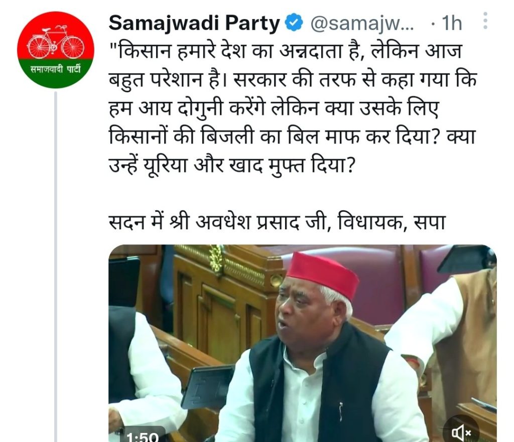 लखनऊ। समाजवादी पार्टी के विधायक अवधेश प्रसाद ने सोमवार को विधानसभा सत्र के दौरान किसानों की परेशानियों का मुद्दा उठाया। उन्होंने कहा कि किसान हमारे देश के अन्नदाता हैं लेकिन आज बहुत परेशान हैं। सरकार की तरफ से कहा गया कि हम आय दोगुनी करेंगे लेकिन क्या उसके लिए किसानों की बिजली का बिल माफ कर दिया । क्या उन्हें यूरिया खाद मुफ्त में दी।