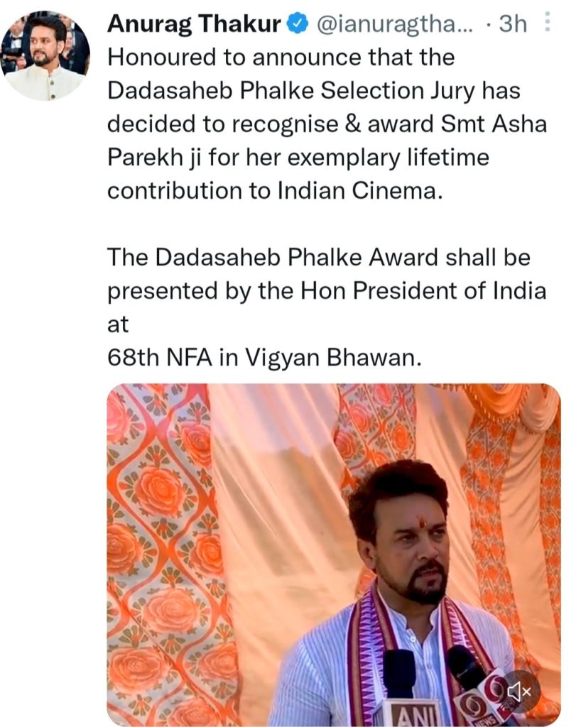 इस निर्णय की घोषणा करते हुए केंद्रीय मंत्री अनुराग ठाकुर ने कहा, “मुझे ये घोषणा करते हुए बहुत खुशी हो रही है कि दादा साहेब फाल्के पुरस्कार की जूरी ने भारतीय सिनेमा में आशा पारेख जी के जीवन भर के अनुकरणीय योगदान को मान्यता देने और उन्हें पुरस्कृत करने का निर्णय लिया है।” सूचना एवं प्रसारण मंत्री श्री ठाकुर ने ये भी घोषणा की कि 68वें राष्ट्रीय फिल्म पुरस्कार समारोह का आयोजन 30 सितंबर, 2022 को होगा और इस समारोह की अध्यक्षता भारत की राष्ट्रपति द्रौपदी मुर्मु करेंगी।
