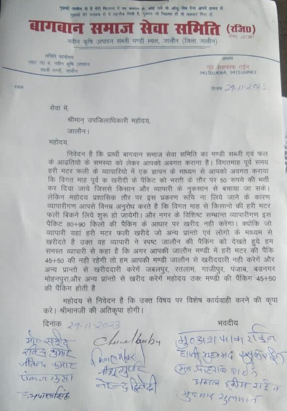 Jalaun news today । जालौन नगर में हरी मटर के व्यापार में बड़ी पैकिंग परेशानी का सबब बनी हुई है और व्यापार में घाटा हो रहा है। मटर व्यापारियों ने एसडीएम को ज्ञापन सौंपकर हरी मटर की पैकिंग 40 से 50 किग्रा में कराने की मांग की है।