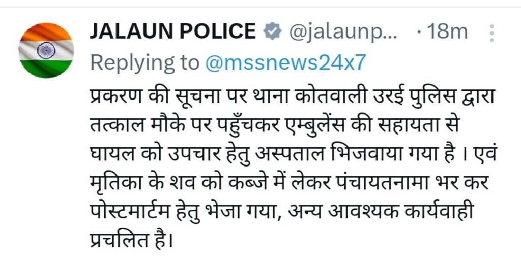 उरई रेलवे क्रॉसिंग पर हुई इस दर्दनाक घटना के सम्बंध में पुलिस ने x पर बयान जारी करते हुए कहा कि प्रकरण की सूचना पर थाना कोतवाली उरई पुलिस द्वारा तत्काल मौके पर पहुंचकर एंबुलेंस की सहायता से घायल को उपचार हेतु अस्पताल भिजवाया गया एवं मृतका के शव को कब्जे में लेकर पंचायत नामा भरकर पोस्टमार्टम हेतु भेजा गया है अन्य आवश्यक कार्रवाई प्रचलित है ।