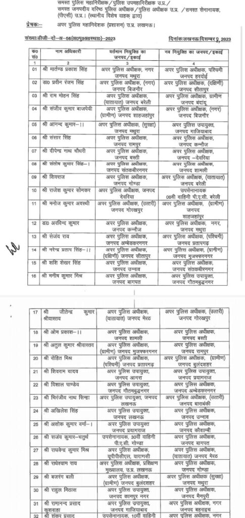 यूपी में चली अपर पुलिस अधीक्षकों की तवादला एक्सप्रेस,, तीन दर्जन से अधिक हुए तवादले,, देखिये पूरी लिस्ट