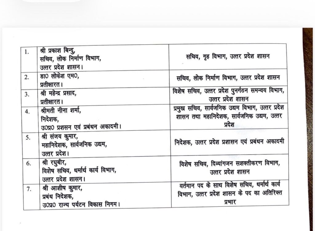 शासन द्वारा जारी की गई लिस्ट के अनुसार आज जिन आईएएस अधिकारियों के तबादले हुए हैं उनमें प्रकाश बिंदु लोक निर्माण विभाग से सचिव गृह बनाए गए हैं। डॉक्टर लोकेश एम जो अभी तक प्रतीक्षा रत चल रहे थे उन्हें लोक निर्माण विभाग का नए सचिव बनाया गया है तो वहीं प्रतीक्षारत चल रहे महेंद्र प्रसाद को विशेष सचिव उत्तर प्रदेश पुनर्गठन समन्वय विभाग बनाया गया है। उत्तर प्रदेश प्रशासन एवं प्रबंधन अकादमी की निदेशक नीना शर्मा को प्रमुख सचिव सार्वजनिक उद्यम विभाग उत्तर प्रदेश शासन तथा महानिदेशक सार्वजनिक उद्यम बनाया गया है । संजय कुमार को उत्तर प्रदेश प्रबंधन अकादमी का नया निदेशक बनाया गया है रघुवीर को विशेष सचिव दिव्यांगजन सशक्तिकरण विभाग बनाया गया है आशीष कुमार को प्रबंध निदेशक राज्य पर्यटन विकास निगम के साथ ही सचिन धर्मार्थ कार्य का अतिरिक्त प्रभार दिया गया है। देखिए पूरी लिस्ट