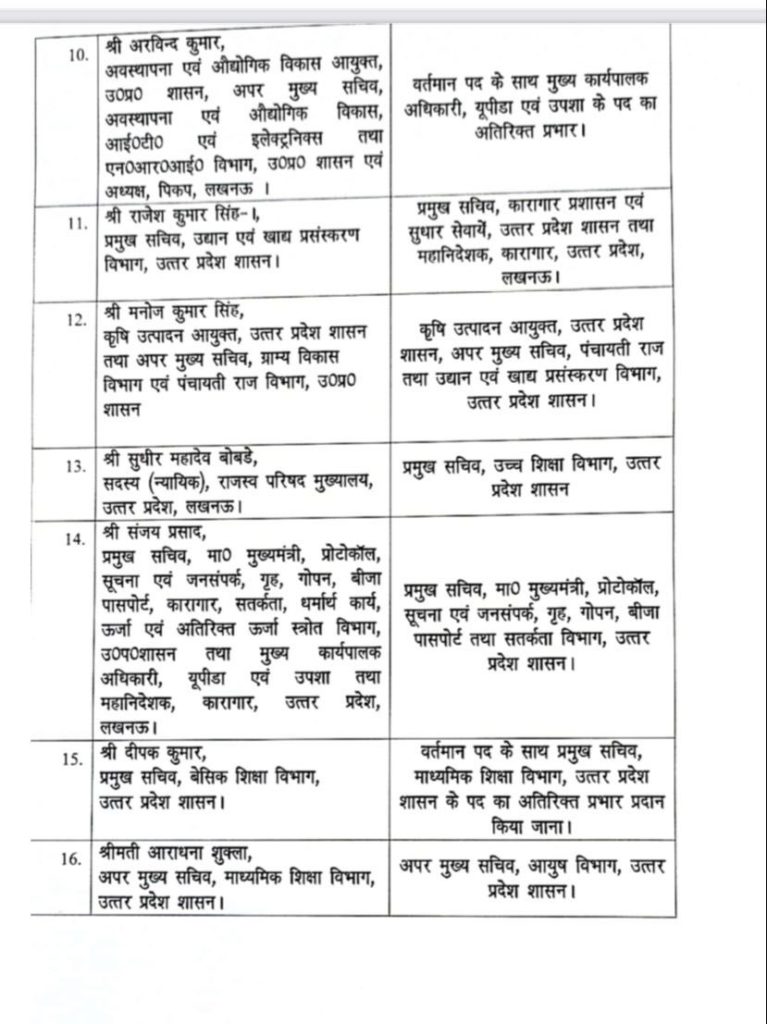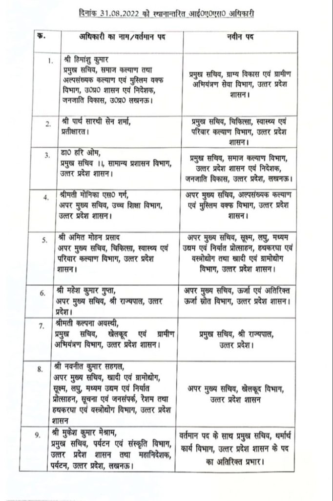 इनमें हिमांशु कुमार को प्रमुख सचिव ग्राम विकास एवं ग्रामीण अभियंत्रण सेवा विभाग बनाया गया तो वही पिछले कई वर्षों से अपर मुख्य सचिव स्वास्थ्य के पद पर तैनात रहे अमित मोहन प्रसाद का विभाग भी बदल कर पार्थसारथी सेन शर्मा को अब नया प्रमुख सचिव स्वास्थ्य एवं चिकित्सा परिवार कल्याण विभाग बनाया गया है डॉ हरिओम शर्मा को प्रमुख सचिव समाज कल्याण विभाग एवं निदेशक जनजाति विकास बनाया गया है मोनिका एस गर्ग को अपर मुख्य सचिव उच्च शिक्षा विभाग से बदल कर अल्पसंख्यक कल्याण एवं मुस्लिम वक्फ विभाग बनाया गया है अमित मोहन प्रसाद को अपर मुख्य सचिव सूक्ष्म लघु मध्यम उद्यम एवं निर्यात प्रोत्साहन हथकरघा एवं वस्त्रोद्योग तथा खादी एवं ग्रामोद्योग विभाग दिया गया है। इसके अलावा महेश कुमार गुप्ता को अपर मुख्य सचिव ऊर्जा एवं अतिरिक्त ऊर्जा स्रोत विभाग बनाया गया है कल्पना अवस्थी को प्रमुख सचिव राज्यपाल बनाया गया है अभी तक सूचना विभाग में अपर मुख्य सचिव रहे नवनीत सहगल का विभाग बदल कर अब वह अपर मुख्य सचिव खेलकूद विभाग बनाए गए हैं। और अब मुख्यमंत्री के प्रमुख सचिव संजय प्रसाद को इस पद के साथ साथ गृह व सूचना एवं जनसंपर्क विभाग की भी जिम्मेदारी दी गई है। इसके अलावा मुकेश कुमार मिश्रा प्रमुख सचिव पर्यटन संस्कृति विभाग महानिदेशक पर्यटन के साथ-साथ सचिव धर्मार्थ कार्य विभाग का काम भी संभालेंगे इसके अलावा अरविंद कुमार को यूपीडा एवं उपशा के पद का अतिरिक्त प्रभार भी दिया गया है अभी तक अपर मुख्य सचिव माध्यमिक शिक्षा विभाग रही आराधना शुक्ला अब आयुष विभाग की अपर मुख्य सचिव बनाई गई है। देखिए पूरी लिस्ट—