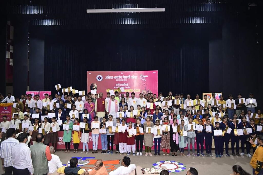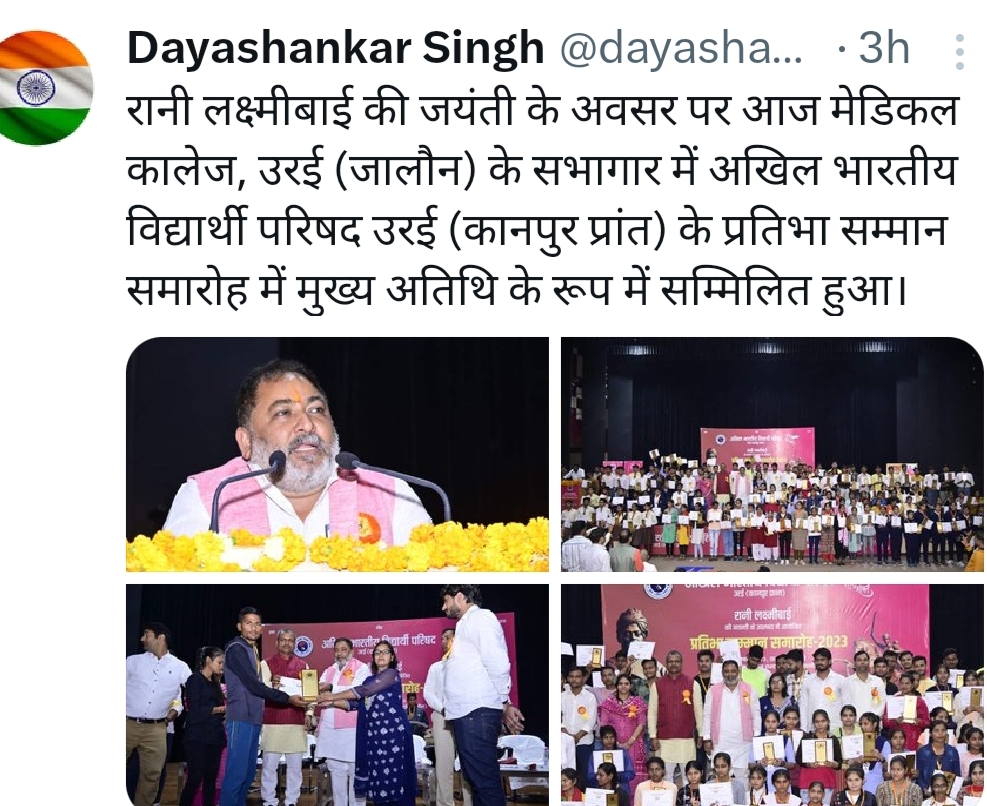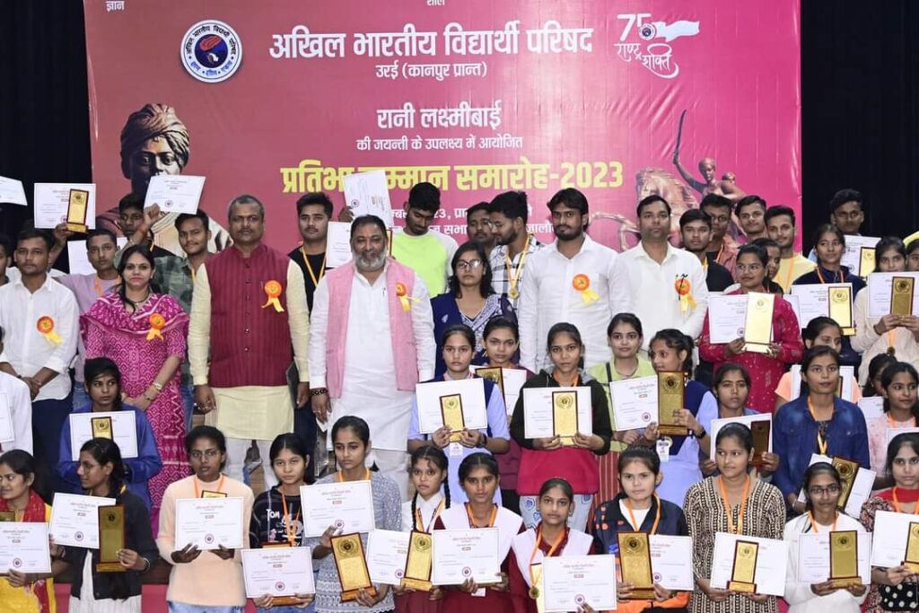 उरई के राजकीय मेडिकल कॉलेज सभागार में ऑडिटोरियम में अखिल भारतीय विद्यार्थी परिषद के द्वारा रानी लक्ष्मीबाई की जयंती पर आयोजित प्रतिभा सम्मान समारोह 2023 में मुख्य अतिथि परिवहन मंत्री दयाशंकर सिंह ने छात्रों को संबोधित करते हुए कहा कड़ी मेहनत सच्ची लगन पक्का इरादा सफलता की कुंजी है। कायर्क्रम की शुरुआत दीप प्रज्वलन के साथ हुई उसके बाद स्वागत के लिए अध्यापक मीनाक्षी शुक्ला का संबोधन हुआ उसके बाद कायर्क्रम की मुख्य भूमिका में उपस्थित प्रांत सह मंत्री निर्मल तिवारी ने छात्रों को संबोधित करते हुए कहा की नारी शक्ति को आज राष्ट्र की आवश्यकता है। सृष्टि का भजन समस्त नारियों के द्वारा हुआ है दुर्गा और रानी लक्ष्मीबाई दोनों शक्ति का रूप है। छात्र शक्ति, राष्ट्र शक्ति है। रानी लक्ष्मी बाई की जयंती पर आयोजित प्रतिभा सम्मान समारोह में जनपद के प्रत्येक विद्यालय के कक्षा 10 और कक्षा 12 के प्रथम द्वितीय और तृतीय स्थान प्राप्त करे हुए बच्चों को सम्मानित किया गया। सम्मानित किया गया विक्रम में स्टेट लेवल पर लंबी कूद में द्वितीय स्थान प्राप्त करने पर सम्मनित किया।