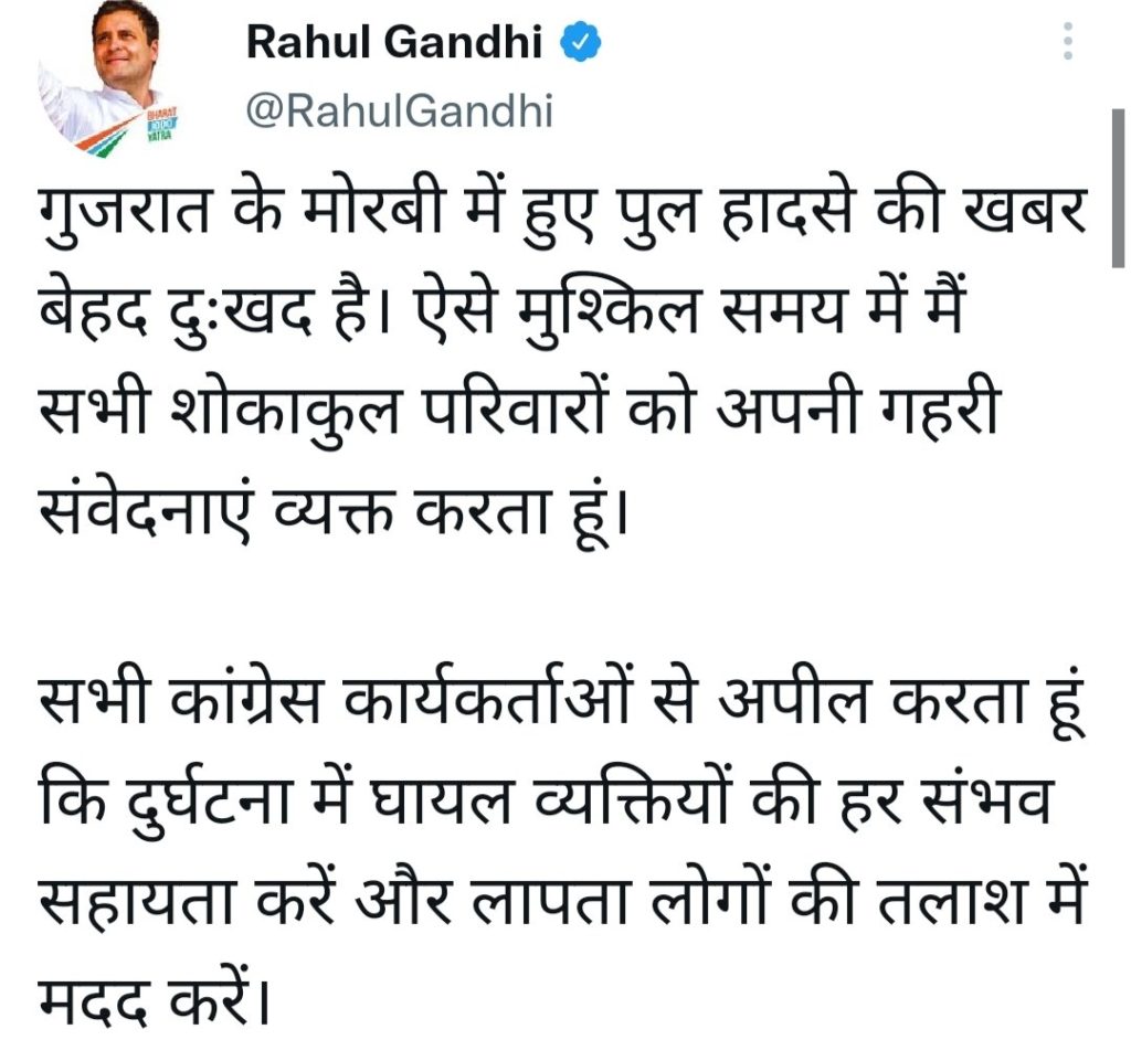 गुजरात के मोराबी में हुई इस दर्दनाक हादसे को लेकर कांग्रेस के वरिष्ठ नेता राहुल गांधी ने शोकाकुल परिवारों के लिए शोक सम्वेदनाएं व्यक्त करते हुए कांग्रेस कार्यकर्ताओं से अपील की की दुर्घटना में घायल व्यक्तियों की हर सम्भव मदद करे और लापता लोगों की तलाश में भी मदद करें।