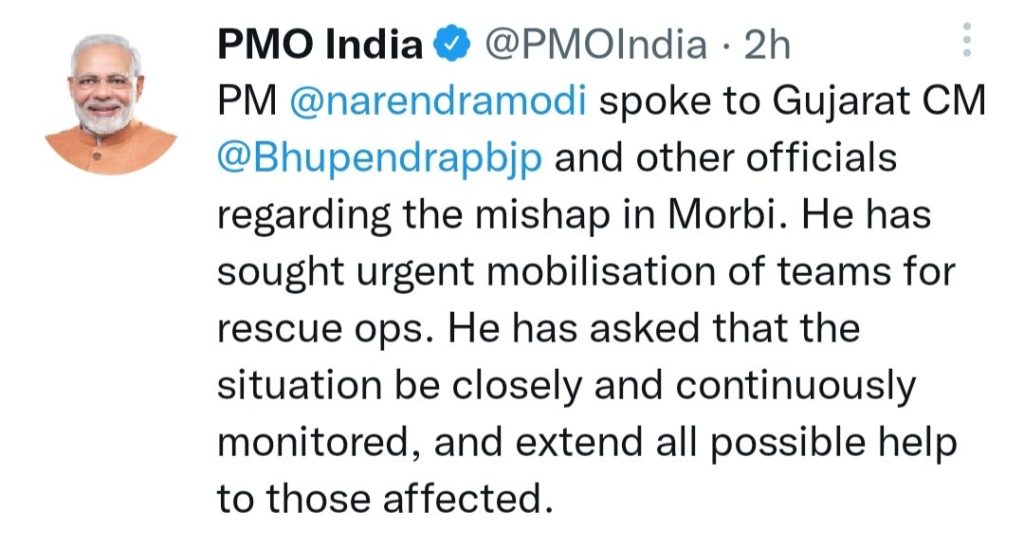 गुजरात की मोरबी में इस दर्दनाक घटना के संबंध में प्रधानमंत्री और गृह मंत्री अमित शाह ने शोक संवेदना व्यक्त की है।