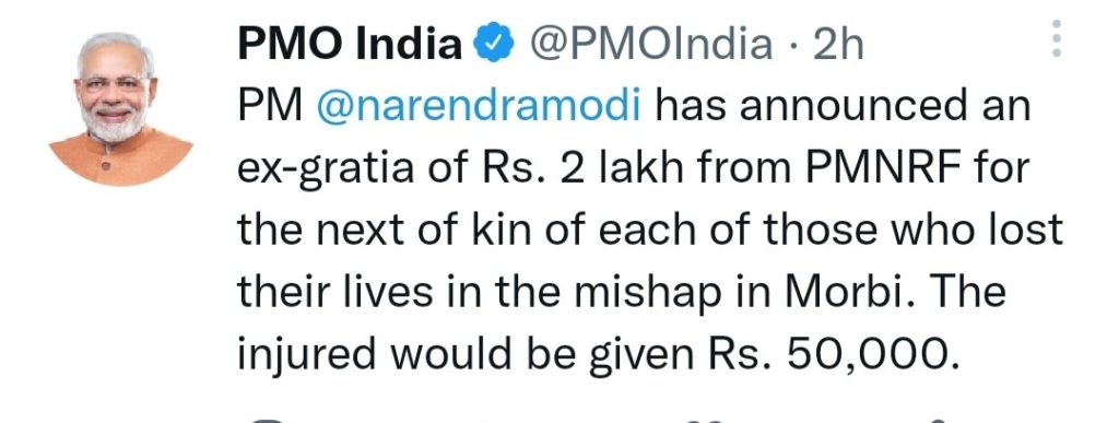 पीएम नरेंद्र नरेंद्र मोदी ने गुजरात के मुख्यमंत्री भूपेंद्र पटेल से बात कर घटना की विस्तार से जानकारी ली और शोक संवेदना व्यक्त करते हुए पीएम मोदी ने मृतकों के आश्रितों को 2 लाख और घायलों को ₹50 हजार की सहायता राशि का ऐलान किया है । और पीएम मोदी ने घायलों के उपचार के लिए निर्देश भी जारी किए हैं।