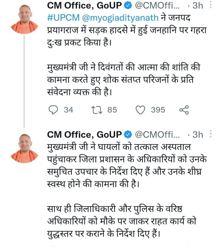 प्रयागराज जनपद में हुए इस दुखद हादसे को लेकर सीएम योगी आदित्यनाथ ने दिवंगतों की आत्मा की शान्ति की प्रार्थना करते हुए शोक संतप्त परिजनों के प्रति संवेदना व्यक्त की है। और अधिकारियों को घायलों को समुचित उपचार के निर्देश जारी किए हैं।