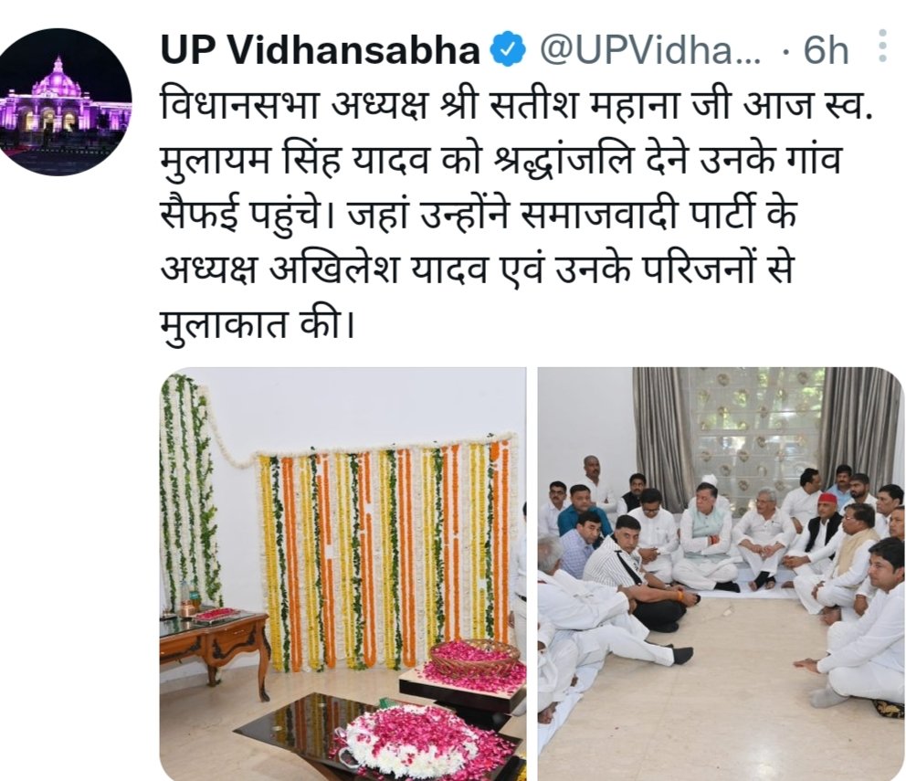 उत्तर प्रदेश के विधानसभा अध्यक्ष सतीश महाना ने शुक्रवार को समाजवादी पार्टी के संरक्षक मुलायम सिंह यादव के निधन के बाद आज उनके सैफई स्थित आवास पर पहुंचकर श्रद्धांजलि अर्पित की। इस अवसर पर विधानसभा अध्यक्ष श्री महाना ने सपा के राष्ट्रीय अध्यक्ष अखिलेश यादव व उनके परिजनों से मुलाकात कर शोक संवेदना व्यक्त की।