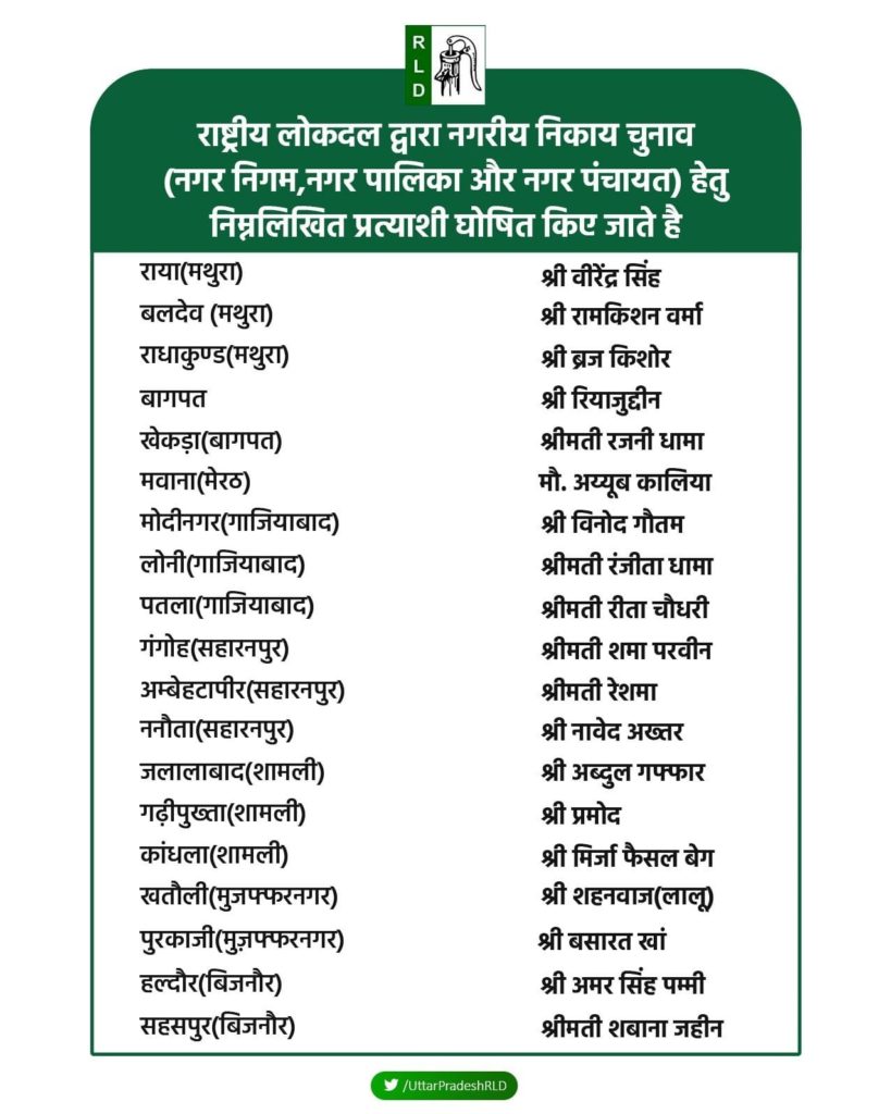 Lucknow। यूपी में होने वाले निकाय चुनाव को लेकर आज RLD ने ( राष्ट्रीय लोकदल) ने चुनाव के लिए प्रत्याशियों की सूची जारी की। मीडिया रिपोर्ट्स के अनुसार आज जिन प्रत्याशियों के नामों का एलान किया गया है उनमें राया मथुरा से वीरेंद्र सिंह आरएलडी प्रत्याशी बलदेव मथुरा से रामकृष्ण वर्मा RLD प्रत्याशी