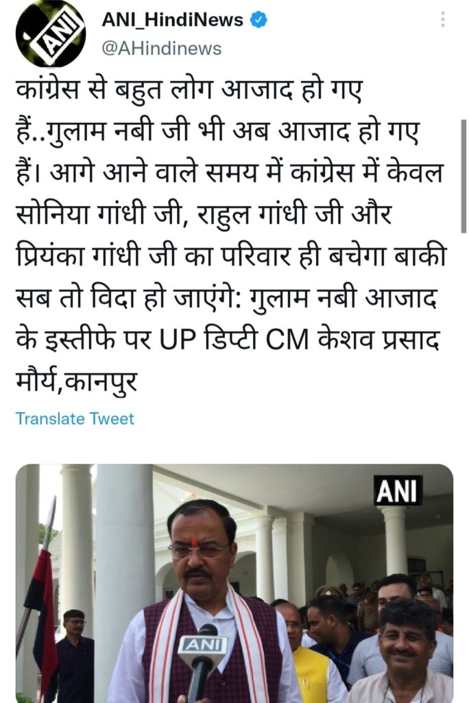 उल्लेखनीय है कि कांग्रेस पार्टी के वरिष्ठ नेता गुलाम नबी आजाद ने बीते कल पार्टी की प्राथमिक सदस्यता के साथ साथ सारे पदों से स्तीफा दे दिया है। श्री आजाद ने सोनिया गांधी को भेजे चार पन्नों के त्यागपत्र में कई आरोप भी लगाए हैं। इसी के चलते आज कानपुर में मीडिया के सवालों का जवाब देते हुए यूपी के डिप्टी सीएम केशव प्रसाद मौर्या ने कांग्रेस पार्टी पर प्रहार किया। ani से बात करते हुए उपमुख्यमंत्री श्री मौर्या ने कहा कि कांग्रेस से बहुत लोग आजाद हो गए हैं गुलाम नबी आजाद भी आजाद हो गए हैं आगे आने वाले समय में कांग्रेस में केवल सोनिया गांधी राहुल गांधी व प्रियंका गांधी और प्रियंका गांधी का परिवार ही बचेगा बाकी सब विदा हो जाएंगे।