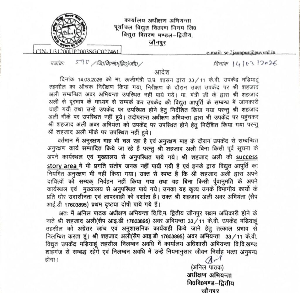 UP News Today । यूपी के नगर विकास एवं ऊर्जा मंत्री ने मिर्जापुर से सुल्तानपुर जाते समय जौनपुर जनपद के मडियाहूं विद्युत उपकेंद्र का औचक निरीक्षण किया। निरीक्षण के दौरान उन्होंने उपकेंद्र की विद्युत व्यवस्था, फीडरों की स्थिति तथा विद्युत आपूर्ति से संबंधित व्यवस्थाओं की विस्तार से जानकारी प्राप्त की।