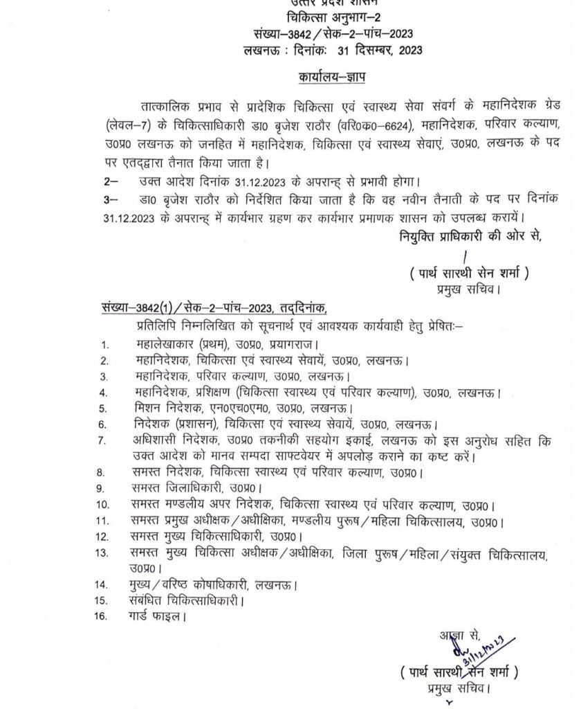 Lucknow news today । उत्तर प्रदेश की डीजी हेल्थ डॉ दीपा त्यागी आज सेवानिवृत्त हो गयी हैं। उनके स्थान पर अब उत्तर प्रदेश के नए डीजी हेल्थ डॉ बृजेश राठौर को बनाया गया है। इसके आदेश जारी कर दिए गए हैं।