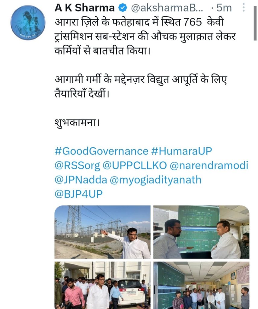 उत्तर प्रदेश के नगर विकास एवं ऊर्जा मंत्री ए के शर्मा आज आगरा के विद्युत उपकेंद्र फतेहाबाद तथा उ0प्र0 पावर ट्रांसमिशन कारपोरेशन लिमिटेड ललितपुर-आगरा पारेषण तंत्र तथा ललितपुर-आगरा ट्रांसमिशन लाइन का औचक निरीक्षण किया।